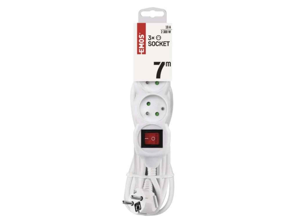 barva: bílá|délka: 7 m|dětské clonky: ano|krytí: IP20|materiál zásuvky a vidlice: plast|max. zátěž: 2 300 W|napětí: 250 V~|počet zásuvek: 3|prodejní obal: 1 ks, závěs|proud: 10 A max.|průřez vodiče: 1,0 mm²|typ izolace: PVC|USB výstup: ne|vodič: H05VV-F3G|vypínač: anoDoplňkové parametry