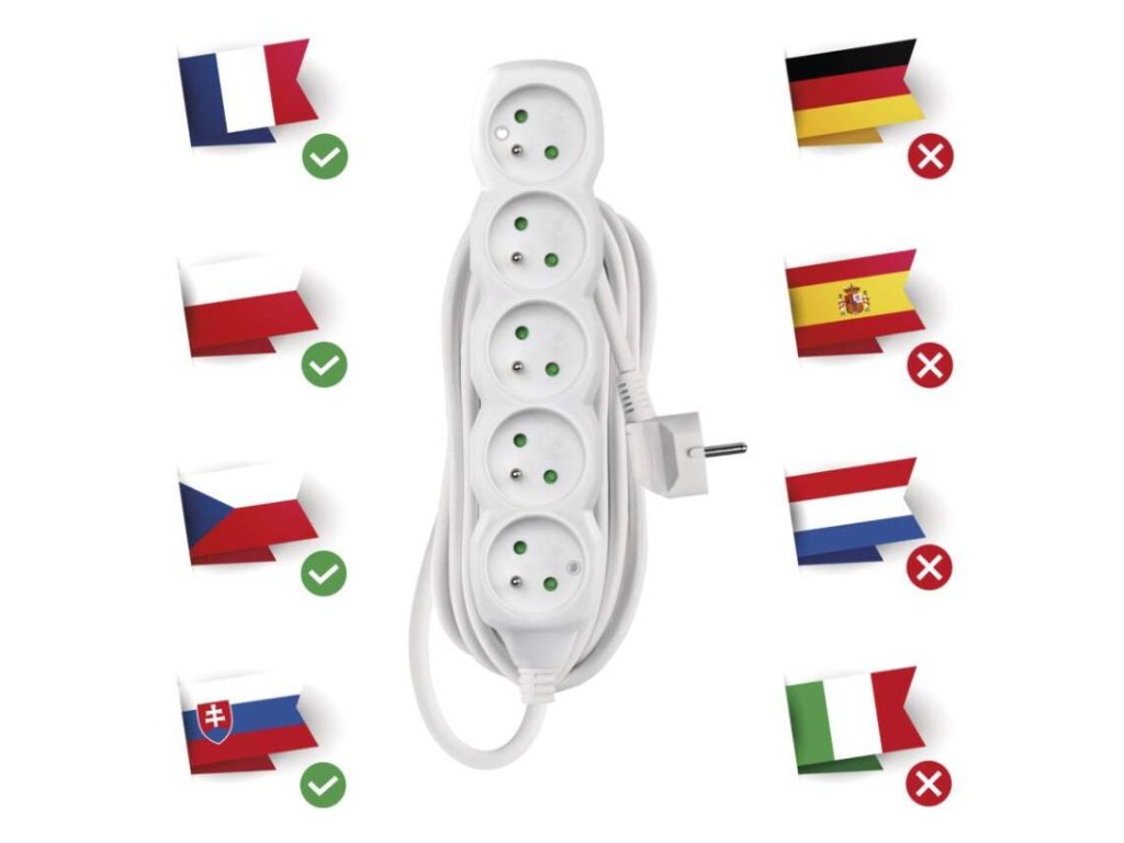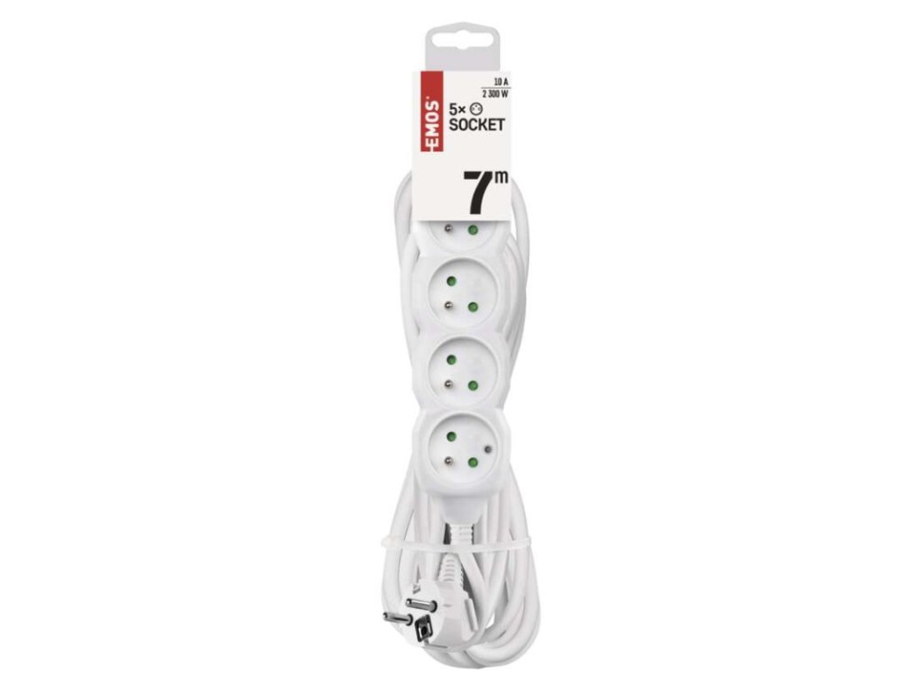barva: bílá|délka: 7 m|dětské clonky: ano|krytí: IP20|materiál zásuvky a vidlice: plast|max. zátěž: 2 300 W|napětí: 250 V~|počet zásuvek: 5|prodejní obal: 1 ks, závěs|proud: 10 A max.|průřez vodiče: 1,0 mm²|typ izolace: PVC|USB výstup: ne|vodič: H05VV-F3G|vypínač: neDoplňkové parametry