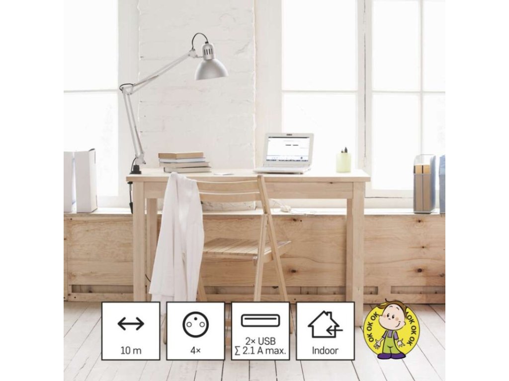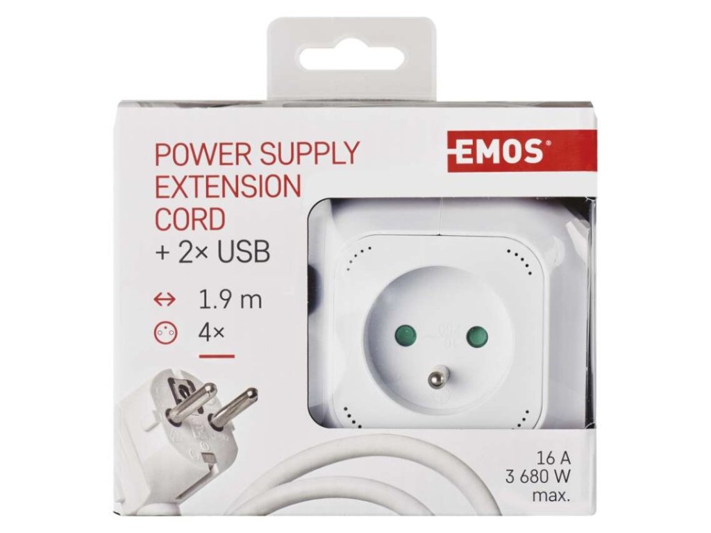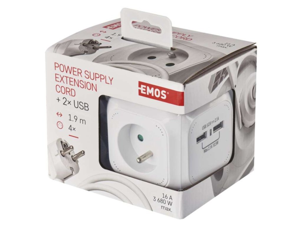 barva: bílá|délka: 1,9 m|dětské clonky: ano|krytí: IP20|materiál zásuvky a vidlice: plast|max. zátěž: 3 680 W|napětí: 250 V~|počet zásuvek: 4|prodejní obal: 1 ks, krabice|proud: 16 A max.|průřez vodiče: 1,0 mm²|typ izolace: PVC|USB výstup: 2× Σ 2,1 A max. (10,5 W)|vodič: H05VV-F3G|vypínač: neDoplňkové parametry