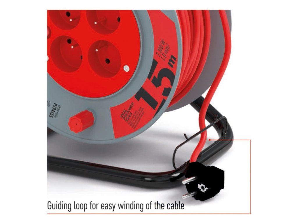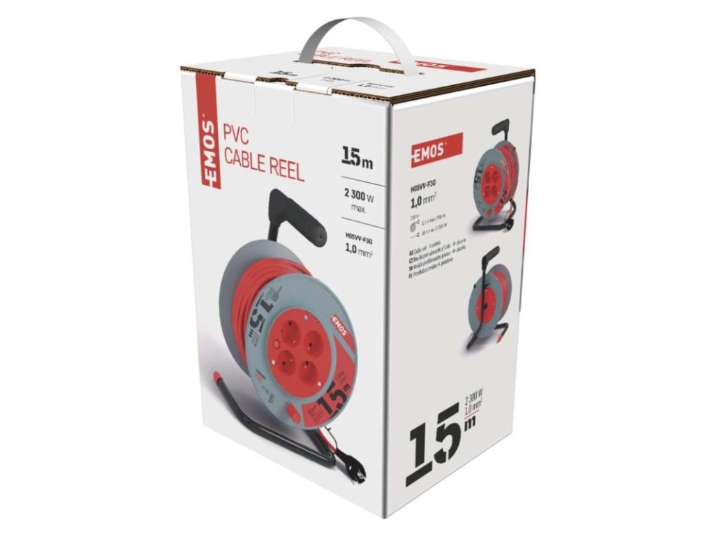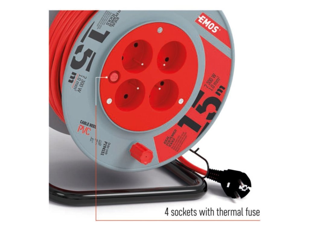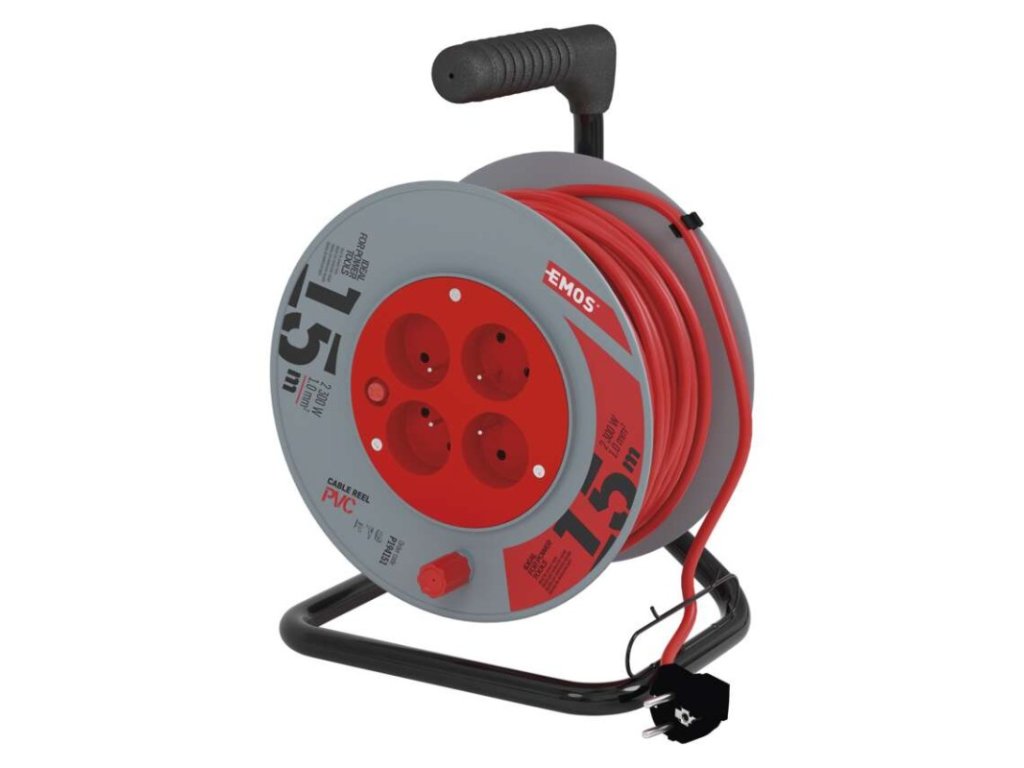 barva kabelu: červená|další funkce: vodící oko, brzda cívky|délka: 15 m|dětské clonky: ne|hmotnost: neuvádí se|krytí: IP20|max. zatížení navinutého: 3,9 A max./900 W|max. zatížení rozvinutého: 10 A max./2 300 W|napětí: 230 V~|počet zásuvek: 4|prodejní obal: 1 ks, krabice|produkt: buben s pohyblivým středem|proud: 10 A|průřez vodiče: 1,0 mm²|rozměr: 210 mm|tepelná pojistka: ano|typ izolace: PVC|vodič: H05VV-F3G|záruční doba: 2 rokyDoplňkové parametry