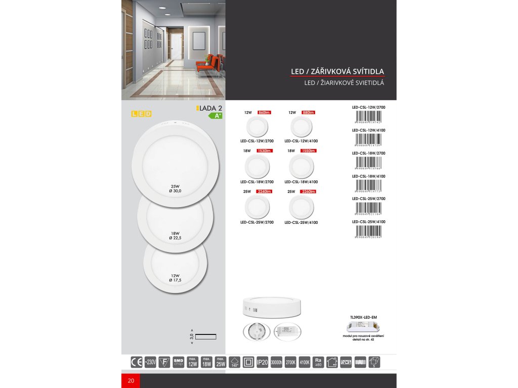 Stylové přisazené svítidlo s moderní a vysoce úspornou SMD LED technologií (2835) je vyrobeno z litého hliníku a plastu. Na výběr jsou 3 velikosti s odpovídajícím výkonem 12W, 18W nebo 25W a teplotou 2700/4100K. Milovníky oblých tvarů potěší model LADA 2, nabízíme ale i čtvercovou verzi RAFA 2. Tato svítidla existují i ve vestavném provedení. Napájecí zdroj (driver) je součástí balení.Doplňkové parametry