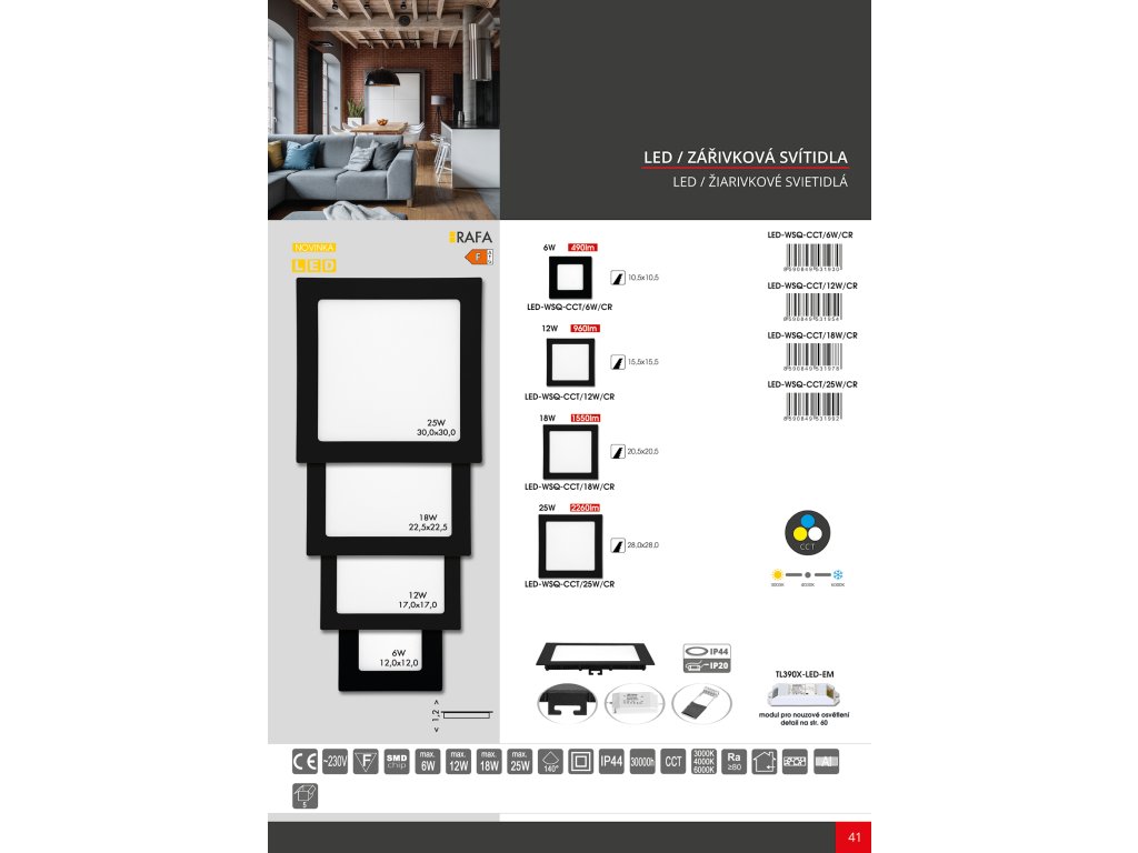 Stylové vestavné svítidlo s moderní a vysoce úspornou SMD LED technologií, které lze díky pružinovému úchytu snadno nainstalovat např. do sádrokartonu, je vyrobeno z litého hliníku a plastu. Verze CCT navíc na kabelu mezi driverem a svítidlem disponuje DIP přepínačem teploty chromatičnosti. Uživatel tak může libovolně volit mezi teplým, neutrálním a studeným světlem. Na výběr je několik velikostí s odpovídajícím výkonem. Milovníky oblých tvarů potěší model LADA, nabízíme ale i čtvercovou verzi RAFA. Napájecí zdroj (driver) je součástí balení.Doplňkové parametry