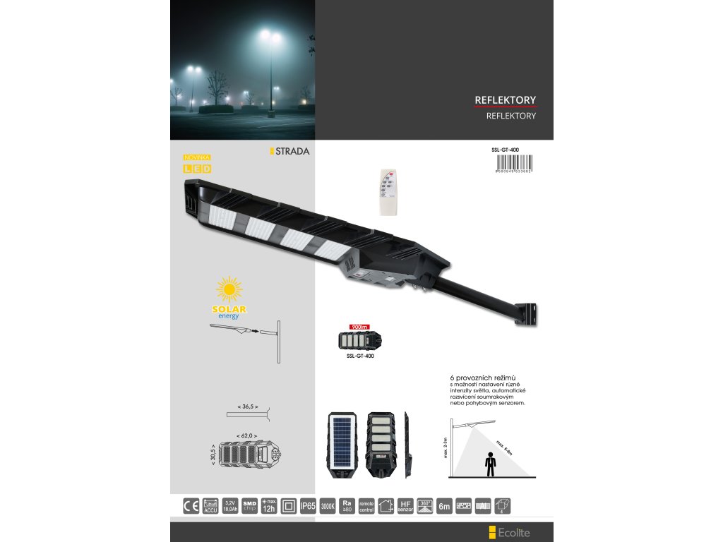 Solární svítidlo s typovým označením STRADA operuje díky integrované lithiové baterii zcela nezávisle na elektrické síti a funguje jen tehdy, když to situace opravdu vyžaduje. Přes den se díky solárnímu panelu na horní straně plastového těla akumulátor dobíji a noci dostatečně osvětluje prostor pod sebou. Přibalené dálkové ovládání umožňuje nastavení několika módů, mezi kterými je kromě automatického zapínání také funkce aktivace pohybem. Výrobek je vybaven vlastním výložníkem, který po uchycení na stěnu v omezeném rozsahu umožňuje i nastavení sklonu. Výborně poslouží při osvětlování okolí budov a tam, kde není možnost připojení k elektrické síti, jako jsou např. rekreační objekty, přístupové cesty nebo garáže. Upozornění: Svítidlo je třeba umístit s ohledem na okolní překážky, které by mohly stínit solárnímu článku a znemožnit tak dobíjení baterie.Doplňkové parametry