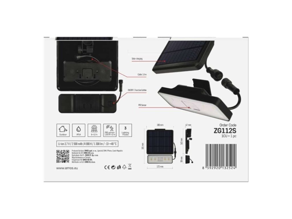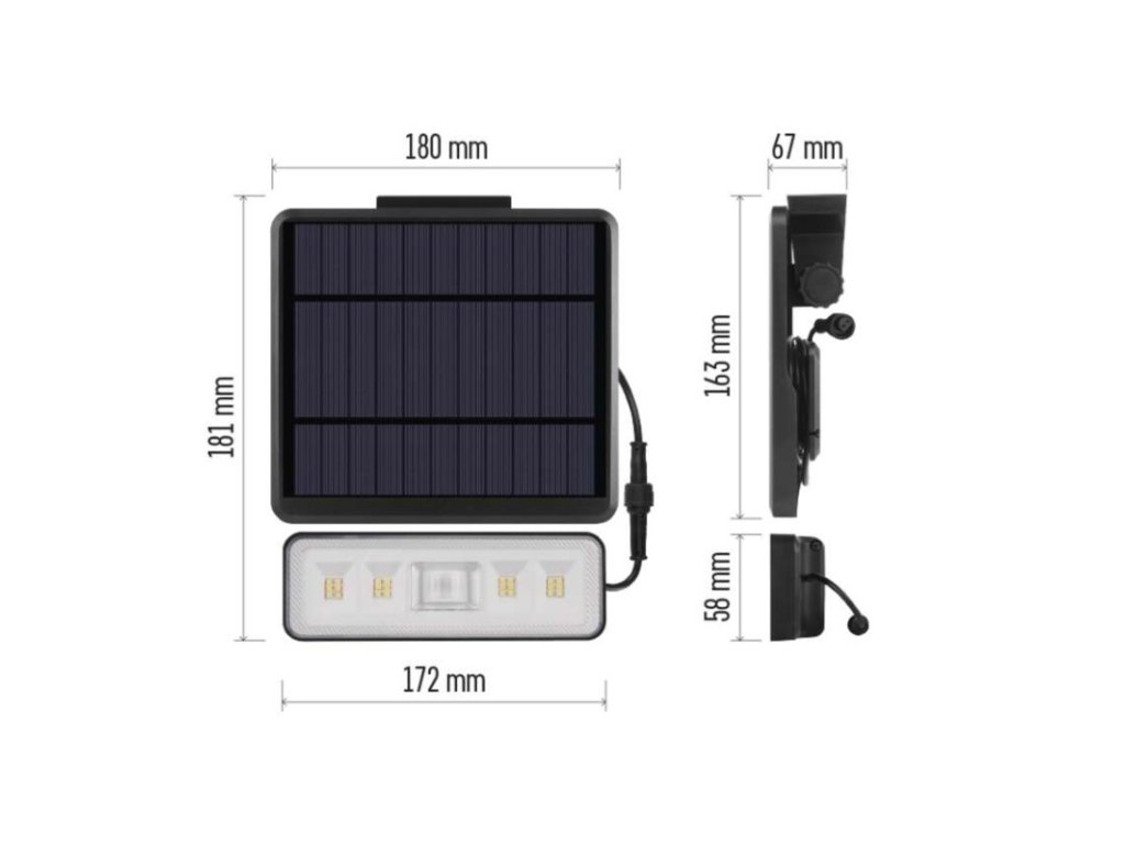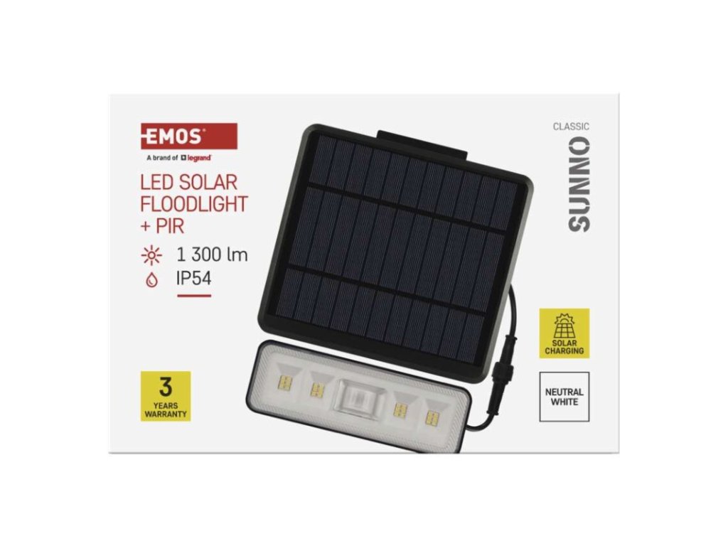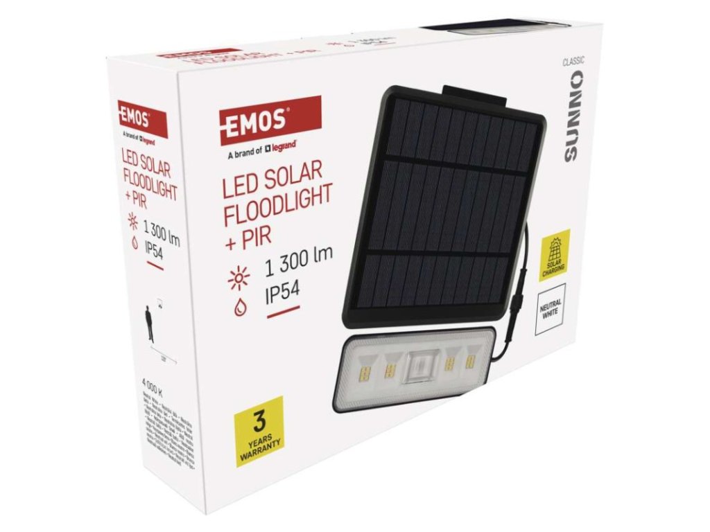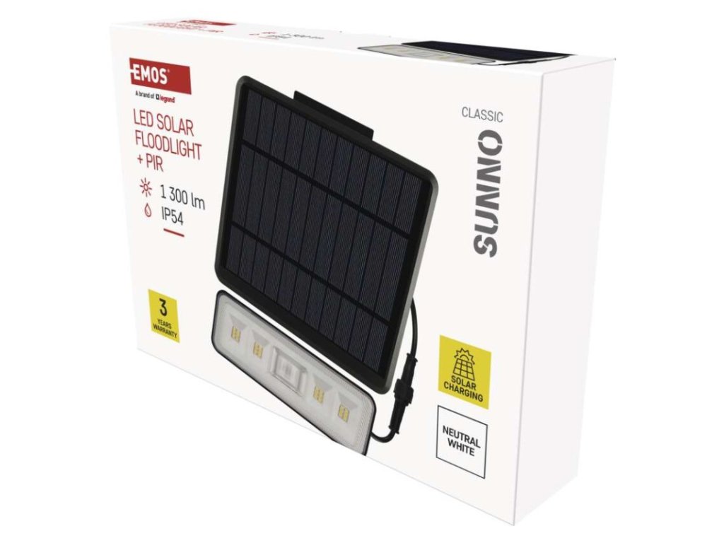 akumulátor: Li-Ion 2 500 mAh|barva: černá|barva světla: neutrální bílá|délka přívodního kabelu: 1,8 m|doba svícení na AKU: –|dosah PIR senzoru: 6 m|energetická třída použitého světelného zdroje: –|flicker-free: nebliká|frekvence: –|index podání barev (CRI): Ra > 80|kategorie: CLASSIC|krytí: IP54|materiál difuzoru: plast (PC)|materiál přívodního kabelu: –|materiál těla: plast (ABS+PC)|napájení: solární|napětí: 3,7 V|PIR senzor: ano|počet průchozích zásuvek: –|použití: povrchová montáž|příkon: –|prodejní obal: 1 ks, krabice|proud: –|řada: SUNNO|rozměr: 181 × 180 × 70 mm|rozsah pracovní teploty: -10 °C až +40 °C|stmívání: –|stupeň ochrany proti mechanickým nárazům: –|světelná účinnost: –|světelný tok: 1 300 lm|teplota chromatičnosti: 4 000 K|typ přívodního kabelu: –|typ průchozích zásuvek: –|typ stmívání: –|účiník: –|úhel vyzařování: 100°|záruční doba: 3 roky|zdroj světla: LED|životnost: –|zkušební žárovka součástí balení: neDoplňkové parametry