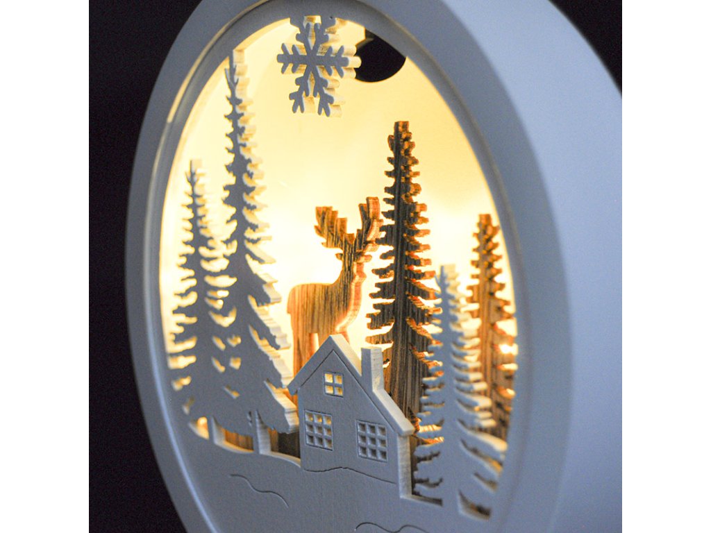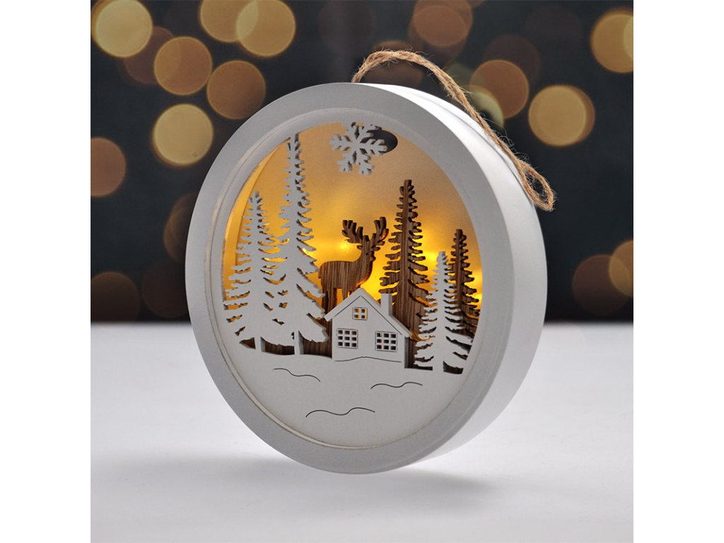 Minimalistická LED dekorace v kombinaci bílé a přírodního dřeva znázorňuje zimní lesní scénu s jelenem a stromy. Uvnitř jsou 4 LED diody s teple bílým světlem, které navozují příjemnou večerní atmosféru. S kompaktními rozměry 14 × 14 × 2,5 cm je dekorace ideální k zavěšení na stěnu, do oken nebo jako ozdoba na poličku.