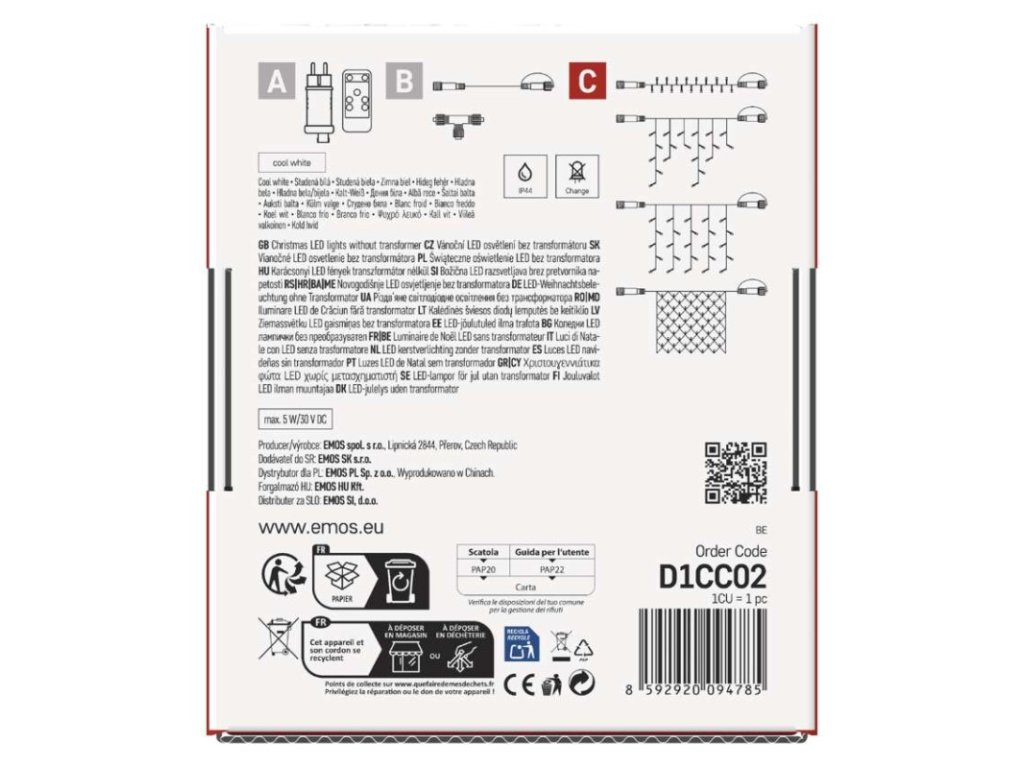 barva drátu: transparentní|barva světla: studená bílá|časovač: neuvádí se|dálkový ovladač: ne|délka přívodu: 10 cm|funkce: svítí/bliká|krytí: IP44|LED mezera: 10 cm|materiál: PVC|možnost propojení: ano|počet LED: 100|použití: venkovní i vnitřní|příkon: max. 5 W|prodejní obal: 1 ks, krabice|produkt: krápníky|pro výšku stromu: neuvádí se|rozměr: 2,5 × 0,9 m|tvar: klasický|typ napájení: síťový adaptér (není součástí balení)|velikost LED: 5 mm|vstupní napětí: 30 V DC|výstupní napětí: neuvádí se|záruční doba: 2 roky|životnost: 10 000 hodinDoplňkové parametry