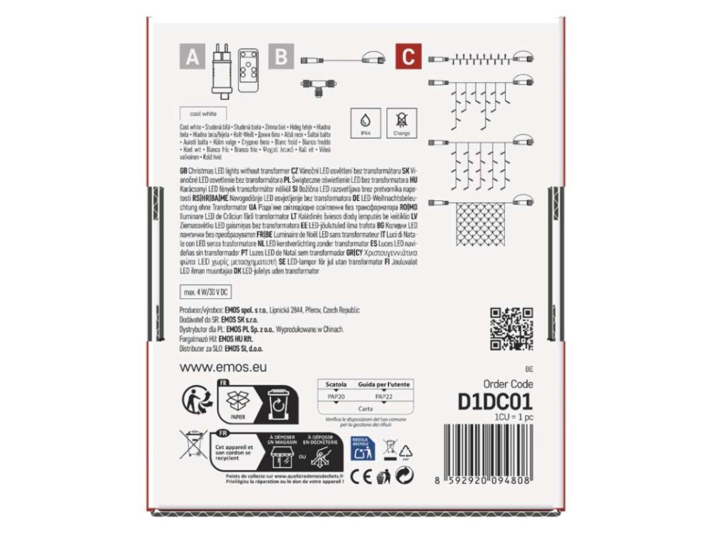 barva drátu: černá|barva světla: studená bílá|časovač: neuvádí se|dálkový ovladač: ne|délka přívodu: 10 cm|funkce: svítí|krytí: IP44|LED mezera: 10 cm|materiál: PVC|možnost propojení: ano|počet LED: 160|použití: venkovní i vnitřní|příkon: max. 4 W|prodejní obal: 1 ks, krabice|produkt: síť|pro výšku stromu: neuvádí se|rozměr: 2 × 1,5 m|tvar: klasický|typ napájení: síťový adaptér (není součástí balení)|velikost LED: 5 mm|vstupní napětí: 30 V DC|výstupní napětí: neuvádí se|záruční doba: 2 roky|životnost: 10 000 hodinDoplňkové parametry