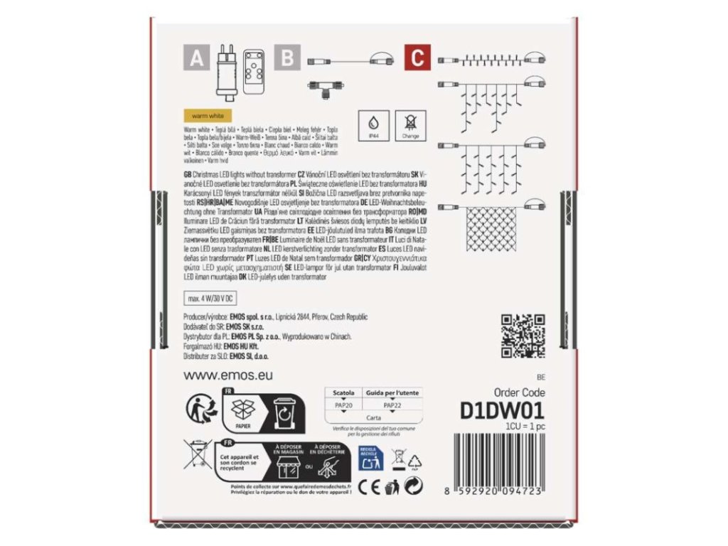barva drátu: černá|barva světla: teplá bílá|časovač: neuvádí se|dálkový ovladač: ne|délka přívodu: 10 cm|funkce: svítí|krytí: IP44|LED mezera: 10 cm|materiál: PVC|možnost propojení: ano|počet LED: 160|použití: venkovní i vnitřní|příkon: max. 4 W|prodejní obal: 1 ks, krabice|produkt: síť|pro výšku stromu: neuvádí se|rozměr: 2 × 1,5 m|tvar: klasický|typ napájení: síťový adaptér (není součástí balení)|velikost LED: 5 mm|vstupní napětí: 30 V DC|výstupní napětí: neuvádí se|záruční doba: 2 roky|životnost: 10 000 hodinDoplňkové parametry