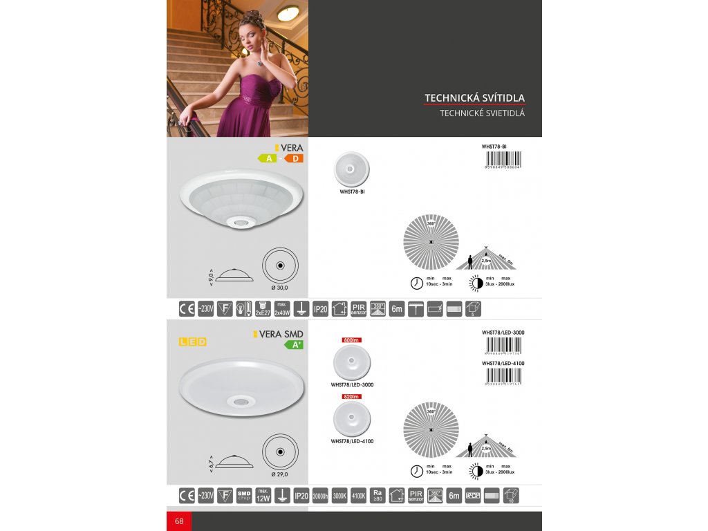 Praktické nástěnné a stropní svítidlo VERA je vyrobeno z plastu a kovu a disponuje senzorem pohybu + setmění. Využívá standardní patici E27 (max. 80W) a lze osadit i úspornou zářivkou. Úhel pokrytí je celých 360˚ a dosah senzoru je až 6 metrů při montážní výšce 2,5m. Pomocí otočných ovladačů je možné nastavit citlivost senzorů a čas sepnutí. Využití najde např: chodby paneláků, WC, schodiště, sklepy, vchody do budov, obchody, nemocnice, sklady, úřady, osvětlení vchodových dveří, předsíní atd. Zdroj není součástí dodávky.Doplňkové parametry