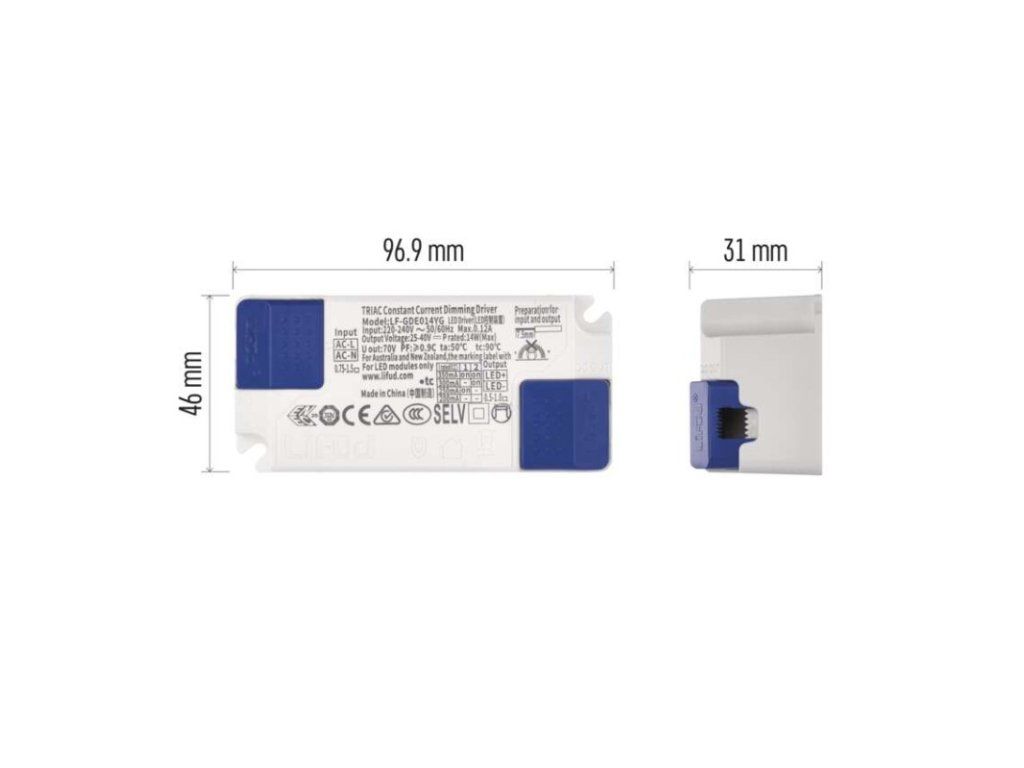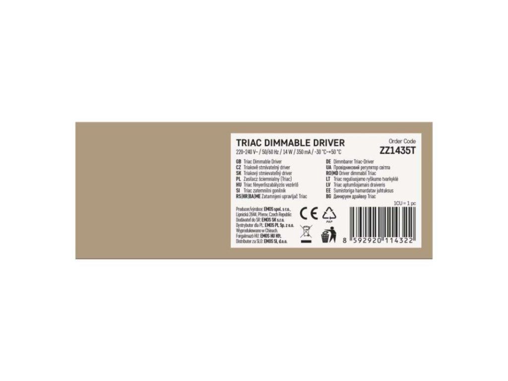 frekvence: 50/60 Hz|napětí na výstupu: 25–42 V DC|napětí vstupu: 220–240 V AC|příkon: 14 W|proud na výstupu: 200–350 mA|rozměr: 122 × 40 × 25 mm|typ: TRIAK|určeno pro: –|záruční doba: 5 letDoplňkové parametry