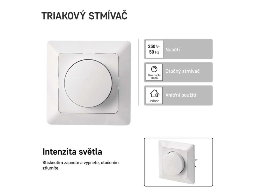 barva: bílá (lesk)|design: 7–110 W/VA vakuové a halogenové žárovky na 230 V~, stmívatelné kompaktní zářivky. 3–60 W/VA pro stmívatelné LED|krytí: neuvádí se|napětí: 230 V~, 50 Hz|prodejní obal: 1 ks, závěs|produkt: přístroj spínače pro regulovatelné LED žárovky pro otočné ovládání a tlačítkové spínání|provedení: otočné ovládání a tlačítkové spínání|způsob montáže: neuvádí seDoplňkové parametry