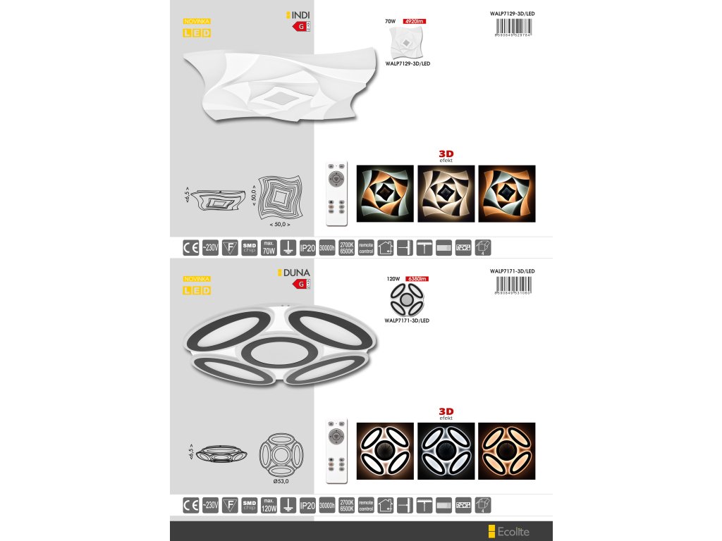 Řada designových akrylátových stropnic WALP využívá vysoce úspornou LED technologii se 2 druhy čipů, které zajišťují dynamický přechod mezi studeným a teplým světlem. Každé svítidlo je pečlivě vyráběno po jednotlivých vrstvách, které v konečném reliéfu důmyslně propouští světlo v různých intenzitách. Výsledkem je abstraktní obrazec, který jako středový prvek ozdobí každý interiér. Součástí balení je dálkové ovládání pro pohodlné nastavení barvy a intenzity světla. Barvu světla lze nastavit i pomocí obyčejného nástěnného vypínače.Doplňkové parametry