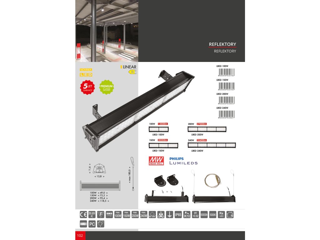 Lineární průmyslové svítidlo LB02 se svým výkonem a zpracováním řadí do kategorie linear high bay, která jsou nejvhodnějším řešením pro osvětlení uliček výrobních hal, skladovacích prostor s vysokým stropem nebo třeba nástupišť. Výrobek je osazen značkovými komponenty od společnosti Meanwell a Philips Lumileds, které spolehlivě ochrání hliníková konstrukce s polykarbonátovým difuzérem při nadstandardním krytí IP65 a maximální mechanickou odolností třídy IK10. S životností přes 50.000 hodin a energetickou třídou D jsou výhodnější náhradou za klasické halogenové reflektory. Součástí balení je ocelové lanko pro závěsnou montáž a úchyty pro montáž přisazením. Rozptyl světla je asymetrický - 60*90°.Doplňkové parametry