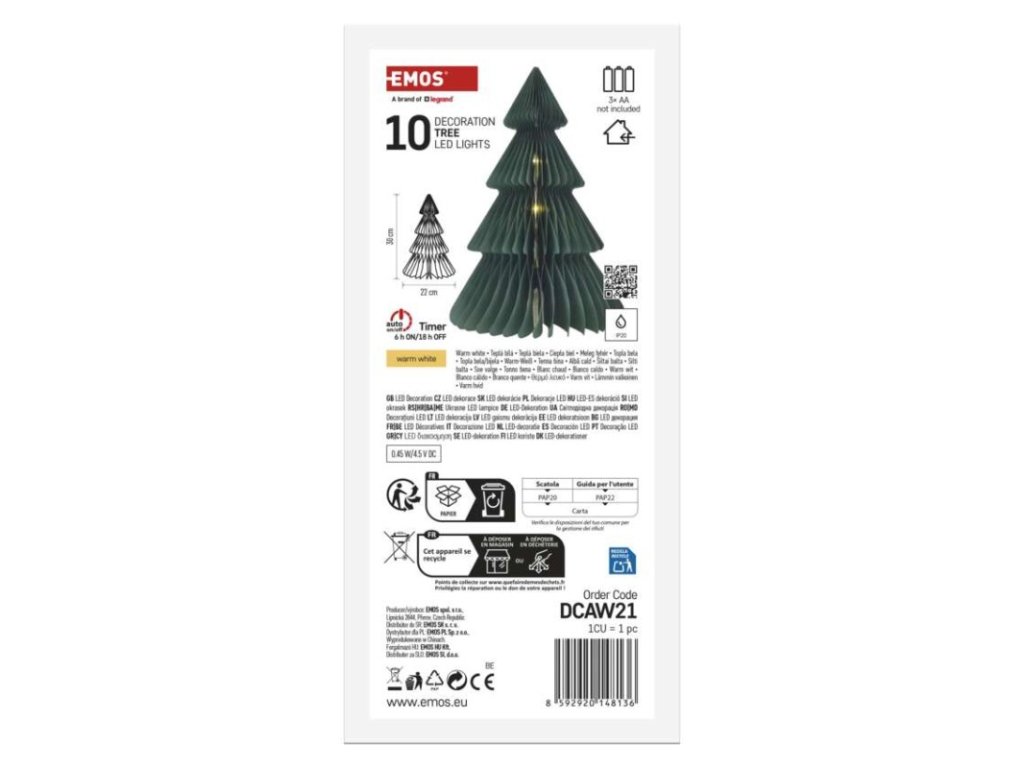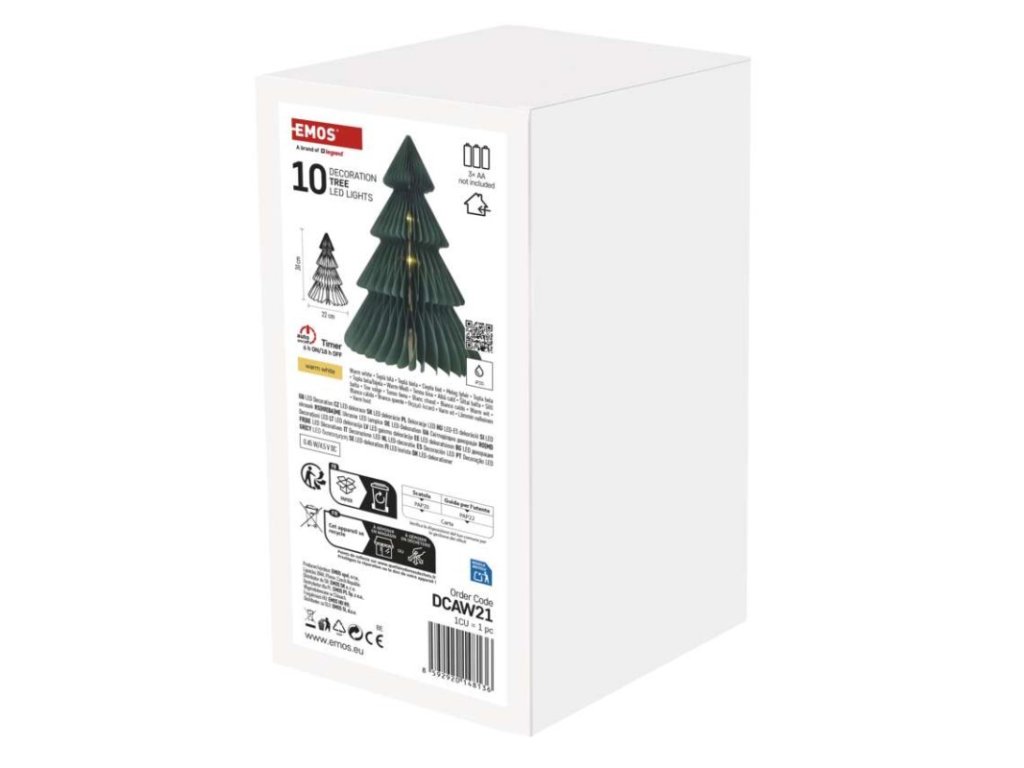 barva drátu: –|barva světla: teplá bílá|časovač: ano|dálkový ovladač: ne|délka přívodu: –|krytí: IP20|materiál: papír|počet LED: 10|použití: vnitřní|příkon: 0,45 W|prodejní obal: 1 ks, krabice|produkt: stromek|rozměr: 22 × 22 × 30 cm|typ napájení: baterie 3× AA (není součástí balení)|vstupní napětí: –|výstupní napětí: 4,5 V DC|záruční doba: 2 roky|zdroj svícení: LED|životnost: 10 000 hodinDoplňkové parametry