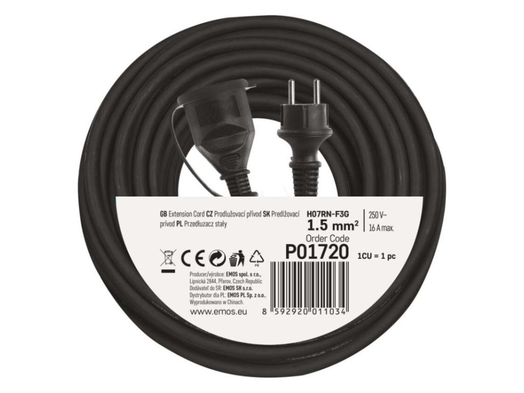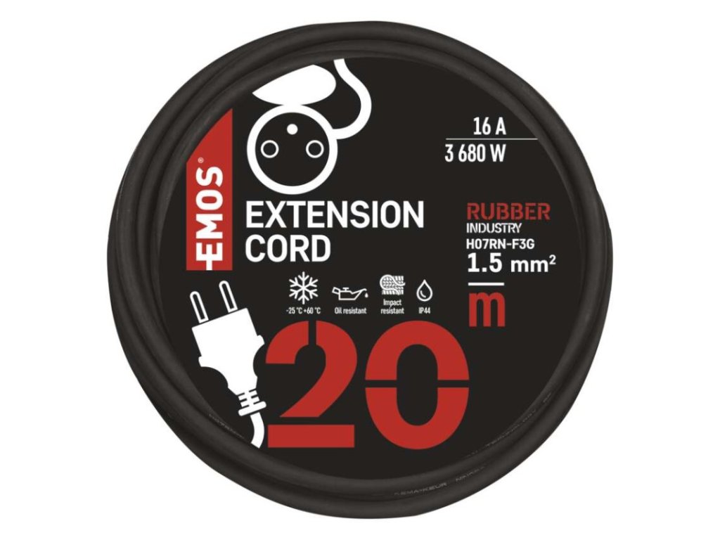 barva kabelu: černá|další funkce: ne|délka: 20 m|dětské clonky: ne|hmotnost: neuvádí se|krytí: IP44|max. zatížení navinutého: neuvádí se|max. zatížení rozvinutého: 16 A max./3 680 W|napětí: 230 V~|počet zásuvek: 1|prodejní obal: 1 ks, sáček|produkt: prodlužovací přívod – spojka|proud: 16 A|průřez vodiče: 1,5 mm²|rozměr: neuvádí se|tepelná pojistka: ne|typ izolace: guma/neopren|vodič: H07RN-F3G|záruční doba: 2 rokyDoplňkové parametry