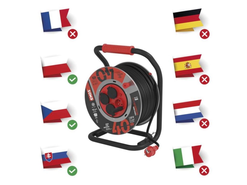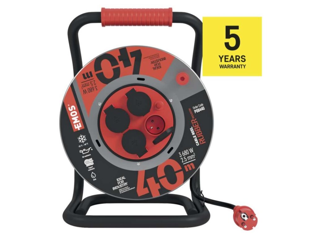 barva kabelu: černá|další funkce: vodící oko, brzda cívky|délka: 40 m|dětské clonky: ne|hmotnost: neuvádí se|krytí: IP44|max. zatížení navinutého: 5,2 A max./1 200 W|max. zatížení rozvinutého: 16 A max./3 680 W|napětí: 230 V~|počet zásuvek: 4|prodejní obal: 1 ks, krabice|produkt: buben s pohyblivým středem|proud: 16 A|průřez vodiče: 2,5 mm²|rozměr: 285 mm|tepelná pojistka: ano|typ izolace: guma/neopren|vodič: H07RN-F|záruční doba: 5 letDoplňkové parametry