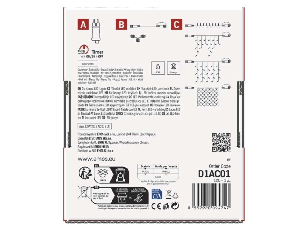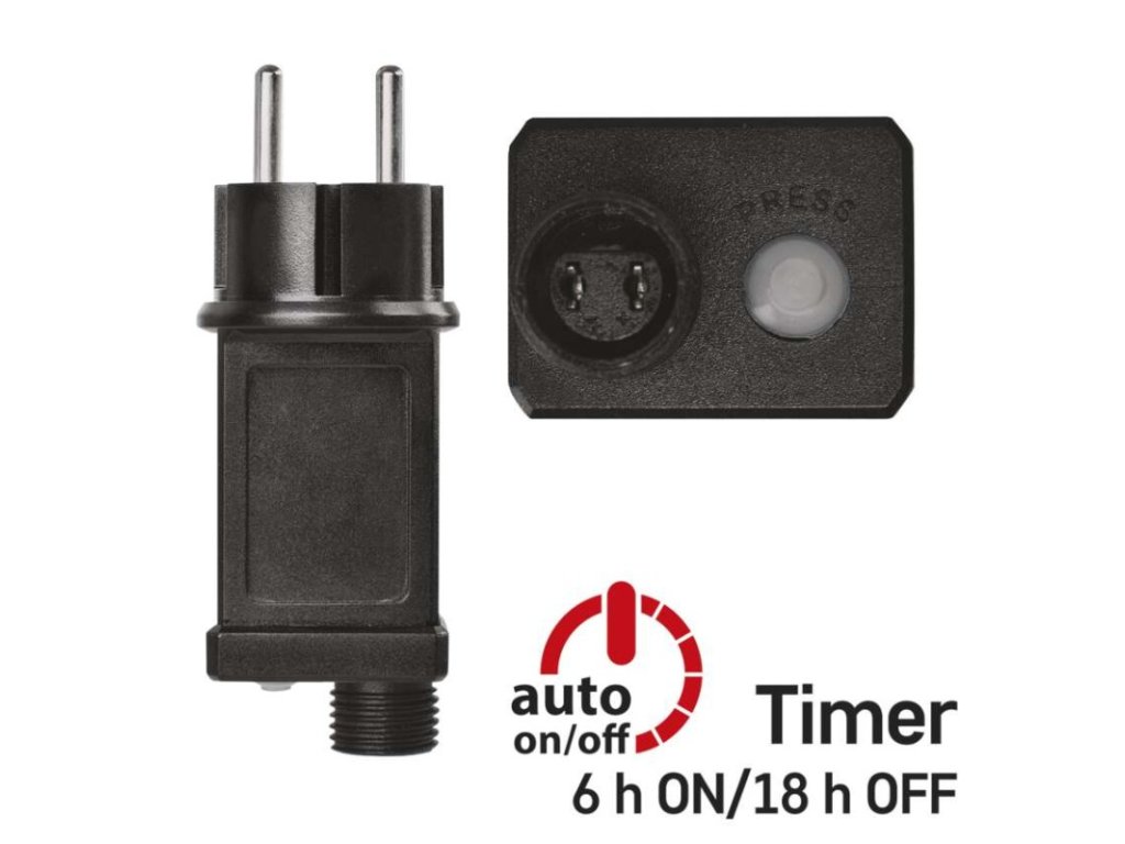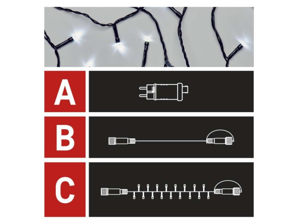 barva drátu: černá|barva světla: studená bílá|časovač: ano|dálkový ovladač: ne|délka přívodu: 5 m|funkce: svítí|krytí: IP44|LED mezera: 10 cm|materiál: PVC|možnost propojení: ano|počet LED: 100|použití: venkovní i vnitřní|příkon: max. 12 W|prodejní obal: 1 ks, krabice|produkt: spojovací řetěz s napájecím zdrojem|pro výšku stromu: neuvádí se|rozměr: 10 m|tvar: klasický|typ napájení: síťový adaptér|velikost LED: 5 mm|vstupní napětí: 230 V AC|výstupní napětí: 30 V DC|záruční doba: 2 roky|životnost: 10 000 hodinDoplňkové parametry