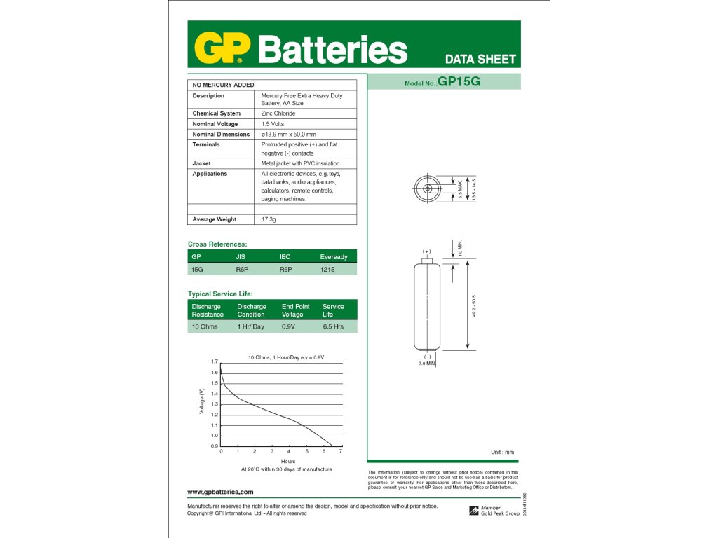 chemické složení: zink-chloridové|hmotnost: 17,3 g|kapacita: neuvádí se|kategorie/řada: Greencell|max. skladovatelnost: 3 roky|možnost nabíjení: ne|napětí: 1,5 V|počet nabíjecích cyklů: nenabíjecí|prodejní obal: 4 ks, fólie|provozní teplota: 0 °C až +45 °C|rozměr: 14,5 × 50,5 mm|typ: R6 (tužka, AA)|velikost baterie: AA|značka: GPDoplňkové parametry