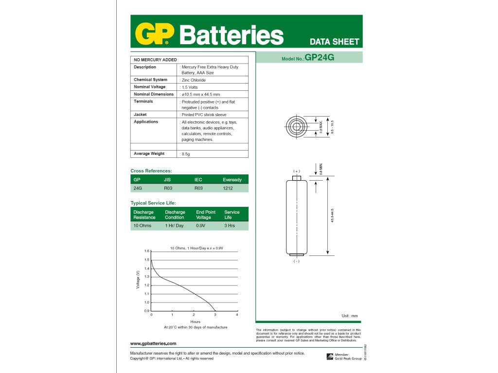 chemické složení: zink-chloridové|hmotnost: 8,5 g|kapacita: neuvádí se|kategorie/řada: Greencell|max. skladovatelnost: 3 roky|možnost nabíjení: ne|napětí: 1,5 V|počet nabíjecích cyklů: nenabíjecí|prodejní obal: 12 ks, fólie|provozní teplota: 0 °C až +45 °C|rozměr: 10,5 × 44,5 mm|typ: R03 (mikrotužka, AAA)|velikost baterie: AAA|značka: GPDoplňkové parametry